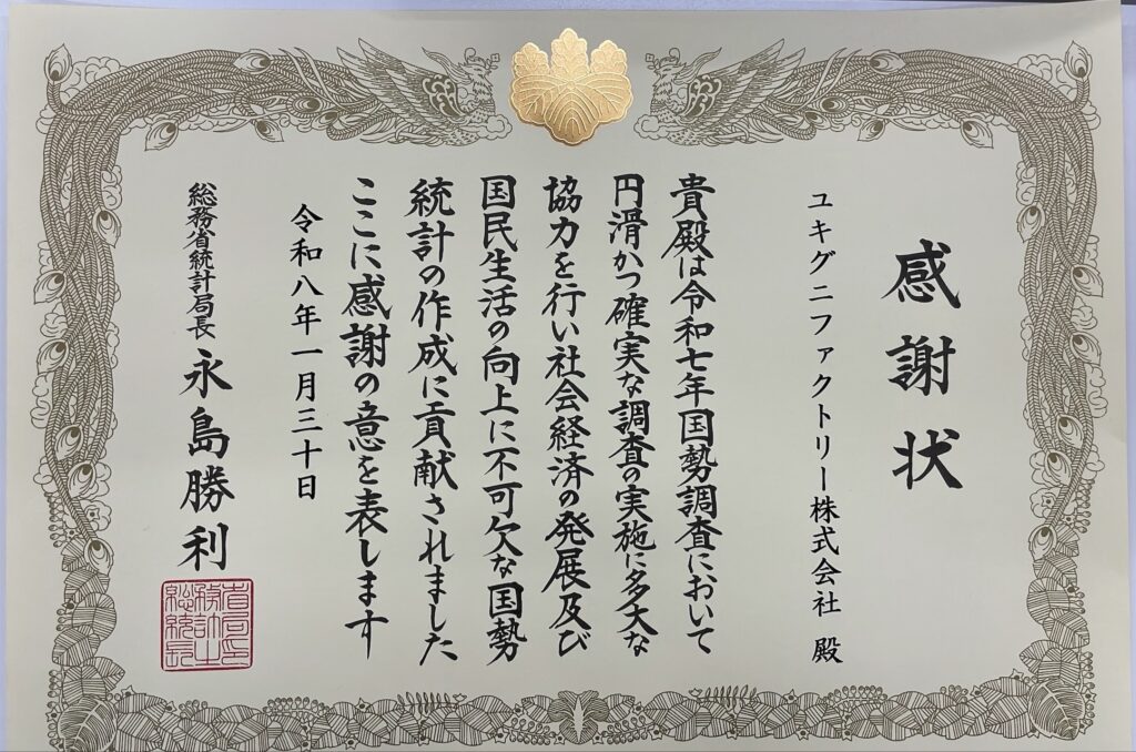 当社は、令和7年国勢調査の円滑な実施に向けて協力したことに対し、総務省統計局より