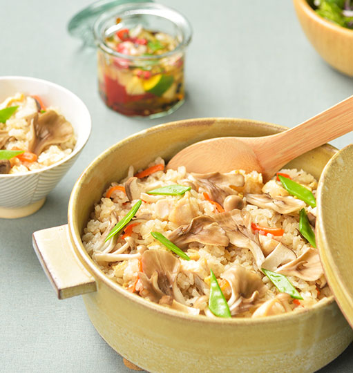 まいたけに含まれる旨みや栄養成分の多くは水溶性。炊き込みごはんは一品で何品目も食材が食べられる手軽さで、美味しさや栄養を無駄にすることのない料理です。また様々な肉や魚介、野菜などと一緒に調理することで旨みの相乗効果が働き、素材の旨みを最大限に引き立てます。