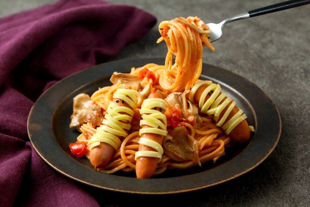 レンジで簡単 雪国まいたけ極トマトソースのミイラスパゲッティ