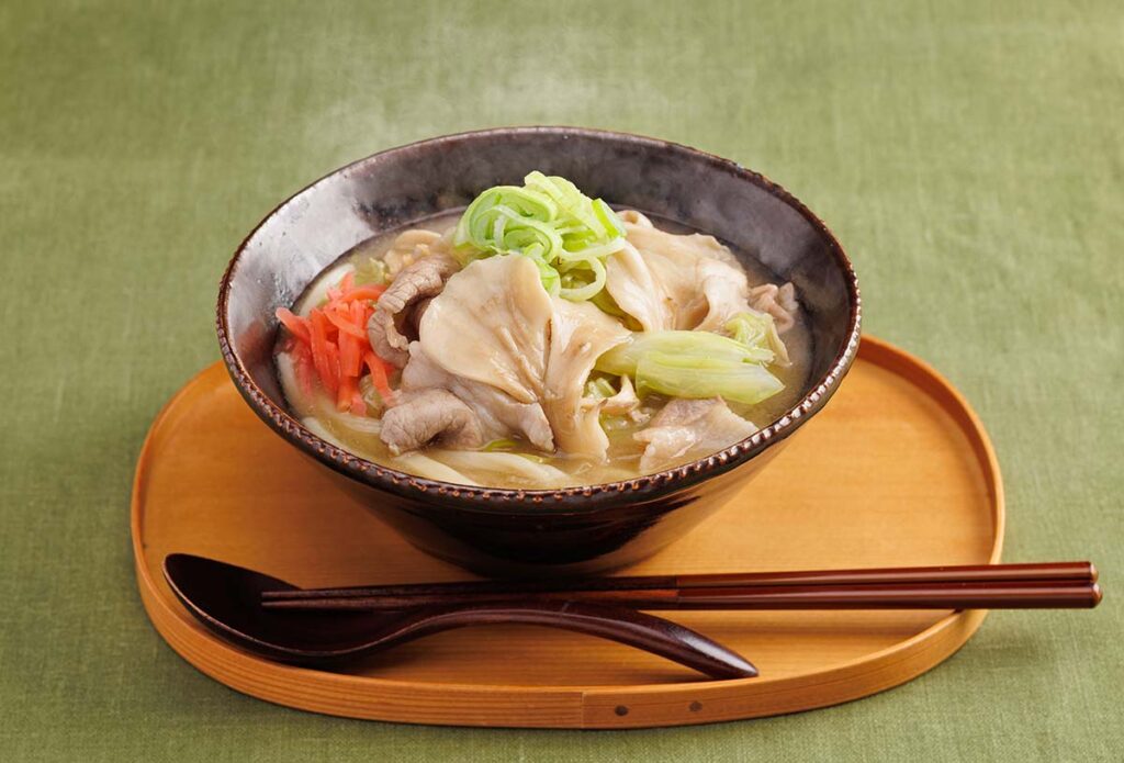 - 鍋に鍋用スープ濃厚豚骨醬油味を入れ、①のまいたけ、長ねぎ以外の野菜、豚肉を入れて煮込む。全体に煮えたら、レンジで包材に記載の通りに加熱した冷凍うどんを加える。器に盛り、紅しょうが、①の長ねぎをのせてできあがり。
