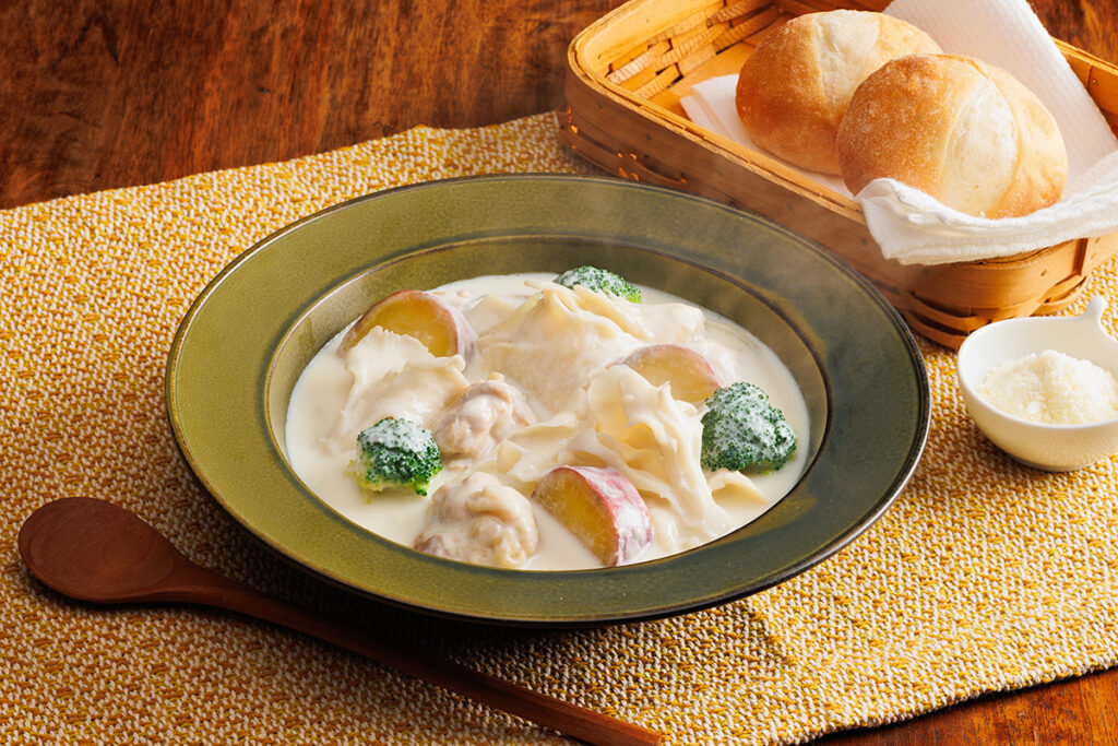 まいたけ、さつまいも、ブロッコリー、玉ねぎを炒め、水、もしくは白ワインを加えてふたをして5分ほど蒸す。 - ふたを開け、水分を飛ばしてから、小麦粉をふるい入れて炒める。