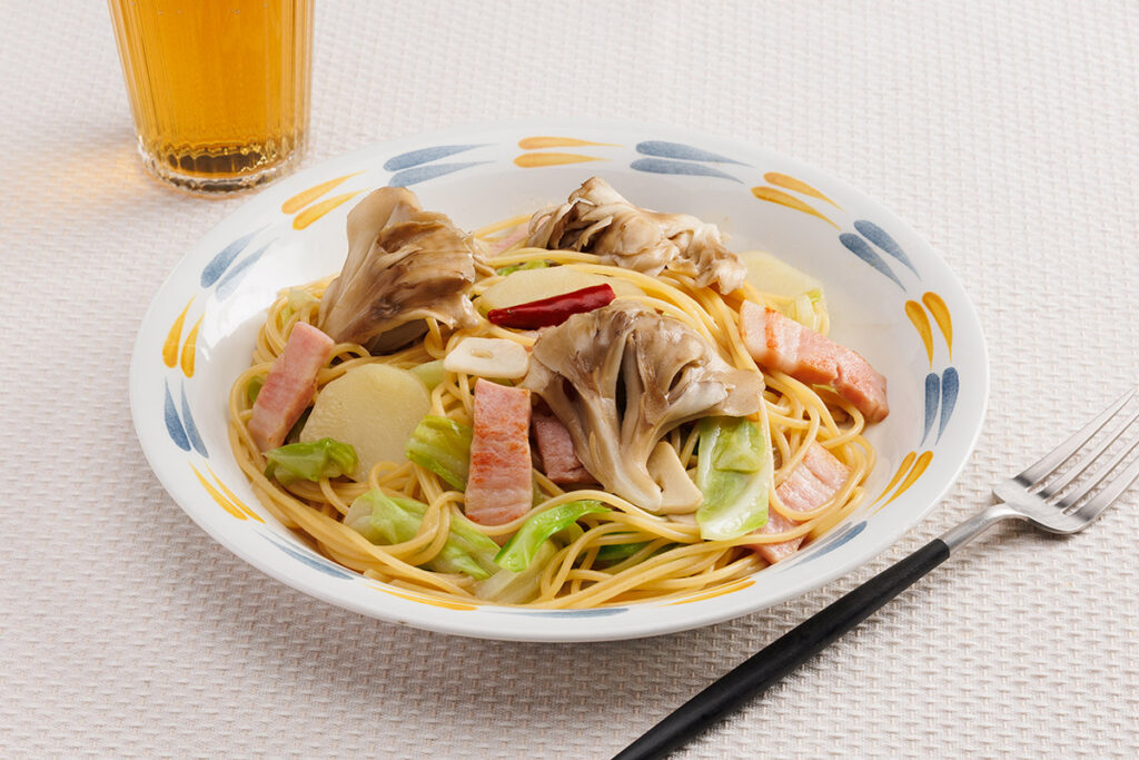 2. フライパンにオリーブオイルを熱し、にんにく、鷹の爪を炒め、香りが立ったら、ベーコン、まいたけ、キャベツを炒める。