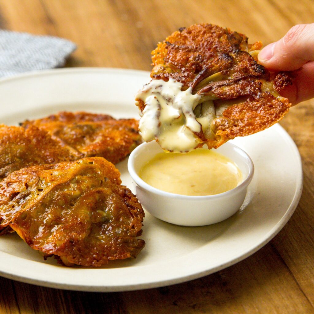 3. フライパンに半量のピザ用チーズを4等分にして広げてまいたけ、炒り大豆をのせ、残りのピザ用チーズを4等分にしてのせる。中火で熱し裏面がきつね色になるまで焼き、上下を返してこんがりと焼く。