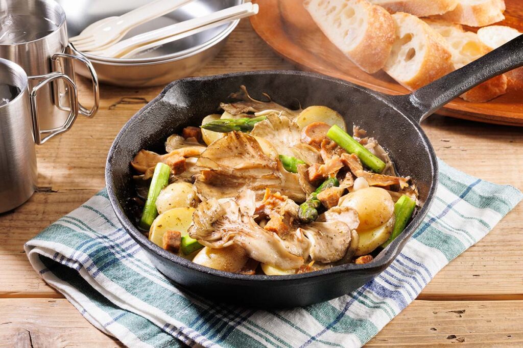 - スキレットにアヒージョソース、①のまいたけ、じゃがいも、アスパラを入れて火にかける。