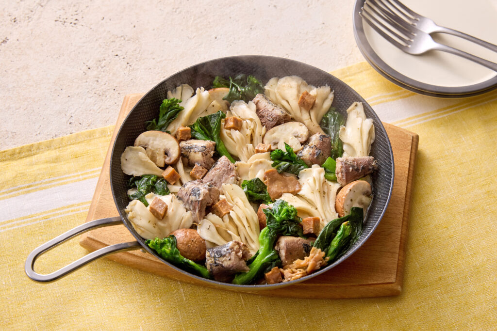 いわし缶と菜の花のキノコアヒージョ